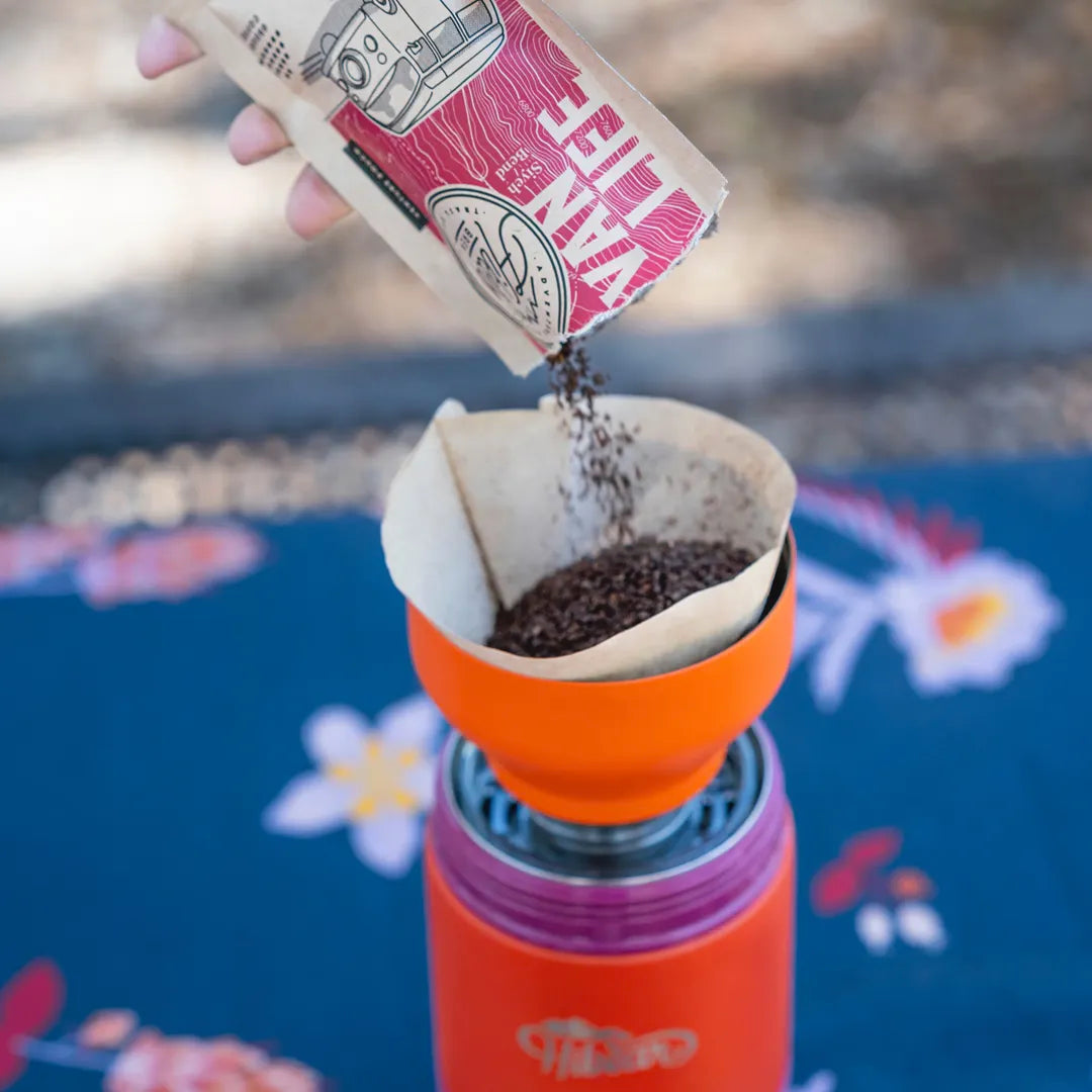 The Hibear Adventure Flask, or the AF, is an all-in-one water bottle, pour over coffee maker, cocktail shaker, and a tea and cold brew maker. All the parts you need to make fantastic coffee in nature (or on the go), fit conveniently inside the flask. We love the AF as a high-quality brewing tool that offers versatility in any location. And the bright colors and custom artwork on the AF don’t hurt, either. So grab your favorite Hikers Brew blend– Here’s how to make camping coffee with the Hibear AF: